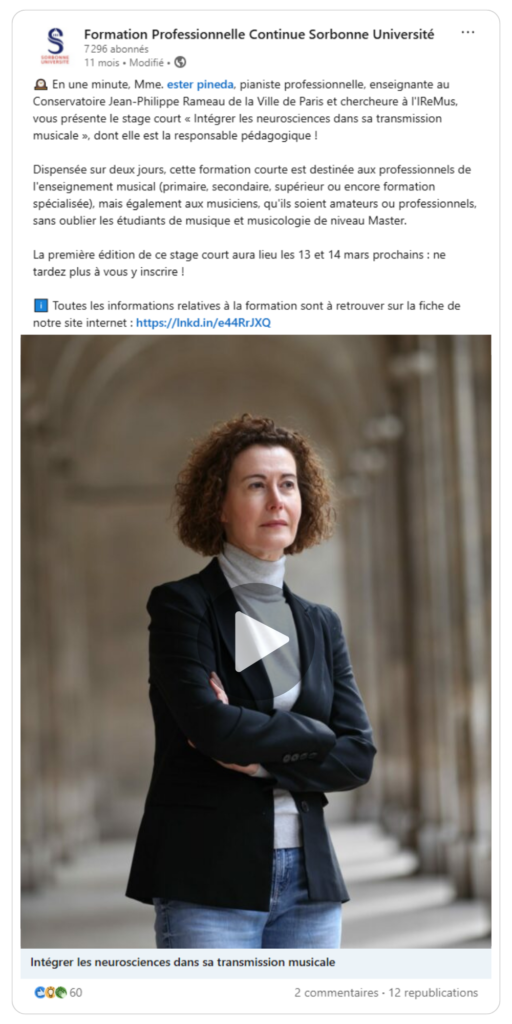 À durée et formats variables, ces formations ciblent une compétence précise et opérationnelle, mobilisable immédiatement dans le cadre professionnel. Parmi les prochaines sessions proposées, deux stages courts se distinguent par leur actualité, leur transversalité et leur ancrage scientifique : « Intégrer les neurosciences dans sa transmission musicale » et « Savoir convaincre : la puissance de la rhétorique ».