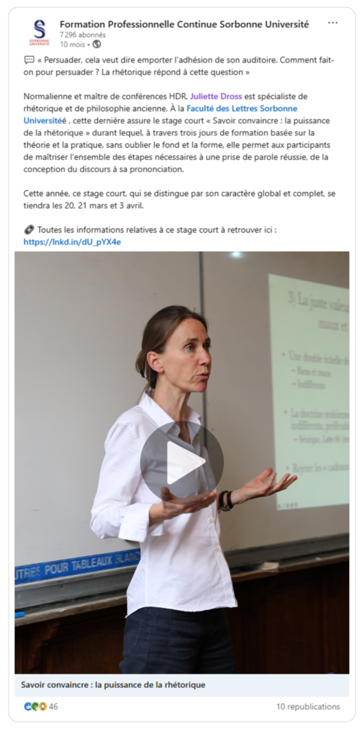 Dans un tout autre registre, mais avec la même exigence intellectuelle et pratique, le stage court Savoir convaincre : la puissance de la rhétorique propose une formation complète à la prise de parole et à la performance oratoire.